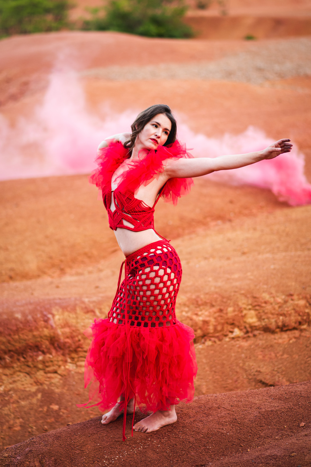 A Kaela egy kézzel csomózott makramé szoknya prémium újrahasznosított pamutzsinórból, amely modern menyasszonyi megjelenésekhez, esküvői after partikhoz, gálaestekhez és exkluzív divateseményekhez készült.
